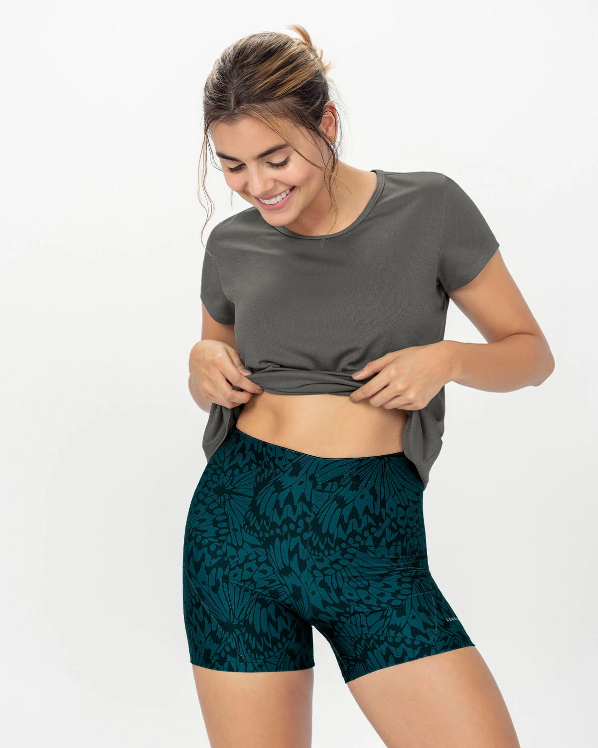 This short comes in various prints and colors. Its style and length give you total freedom of motion for any workout. Its fitted silhouette and light design give it a second-skin feel. It’s made of microfiber, dries quickly, and is breathable. It’s high-waisted with a soft waistband for comfort.