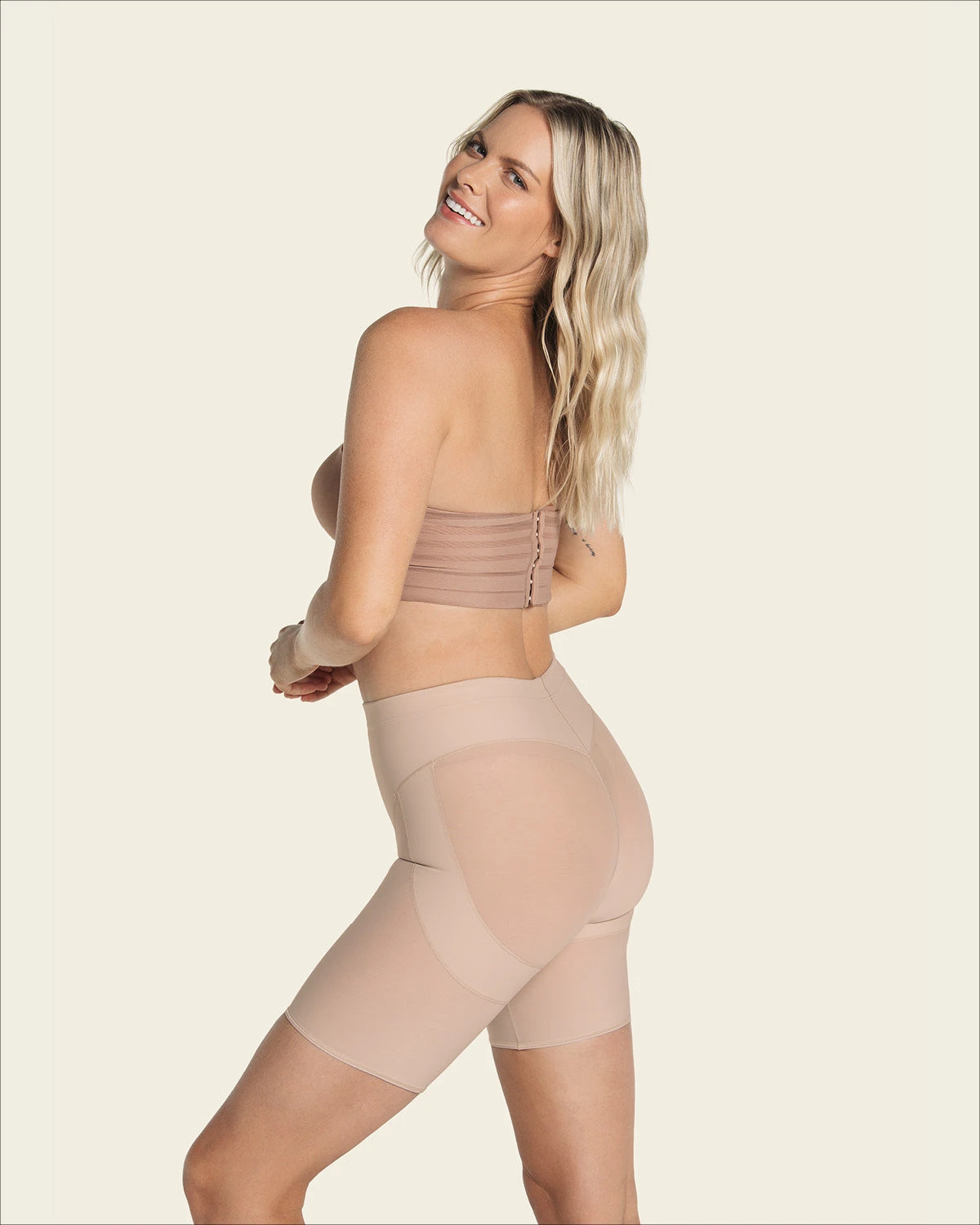 - A firm compression shaper short that sculpts your tummy and upper thighs.