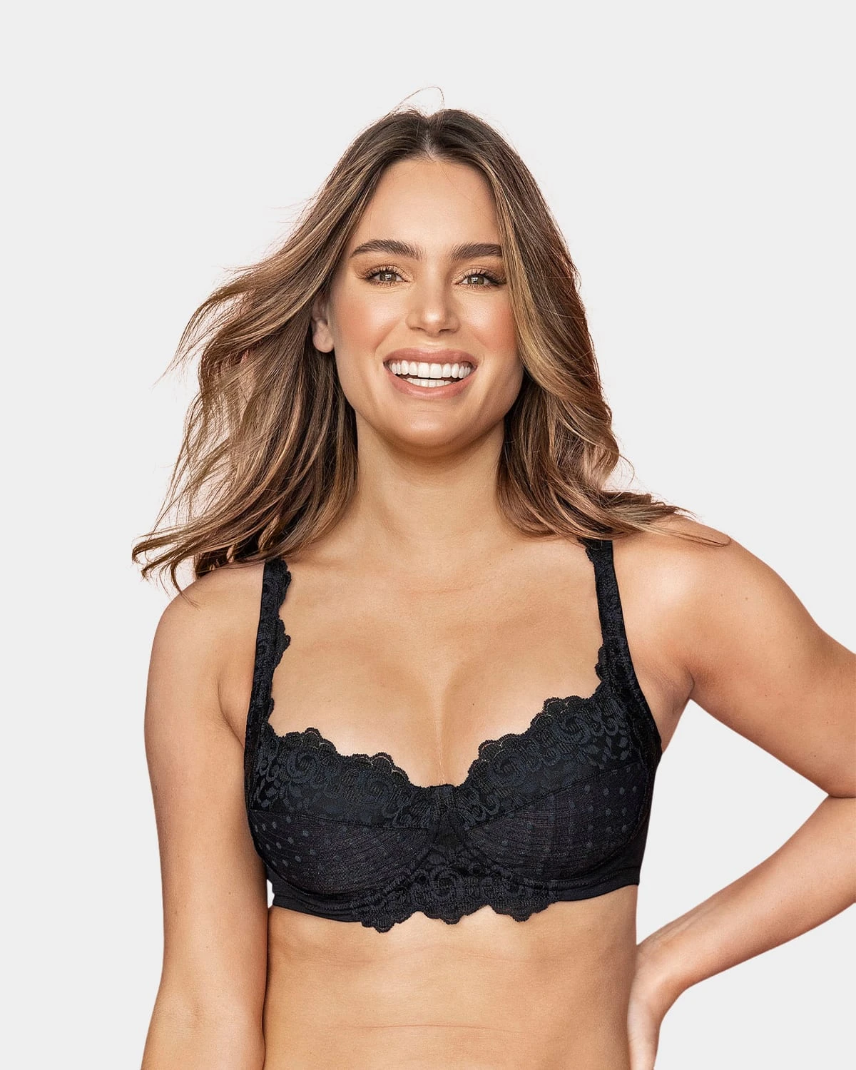 This beautiful bra feature all-around accents of a floral version of our signature SmartLace: it’s on the cups, the underbust band, the sides, and even the straps. It features a tulle polka dot detail on the lower half of the cups for a cute aesthetic. The soft cups have an inner fabric layer for extra coverage under the lace. The bra has high coverage under arms and in the back. The cups have a built-in sling that starts at the straps, providing extra support while centering and lifting the bust. The back and sides, which are made of double-layered tulle fabric, provide smoothing coverage. A 4-level adjustable back hook-and-eye closure lets you adjust it for a perfect fit.