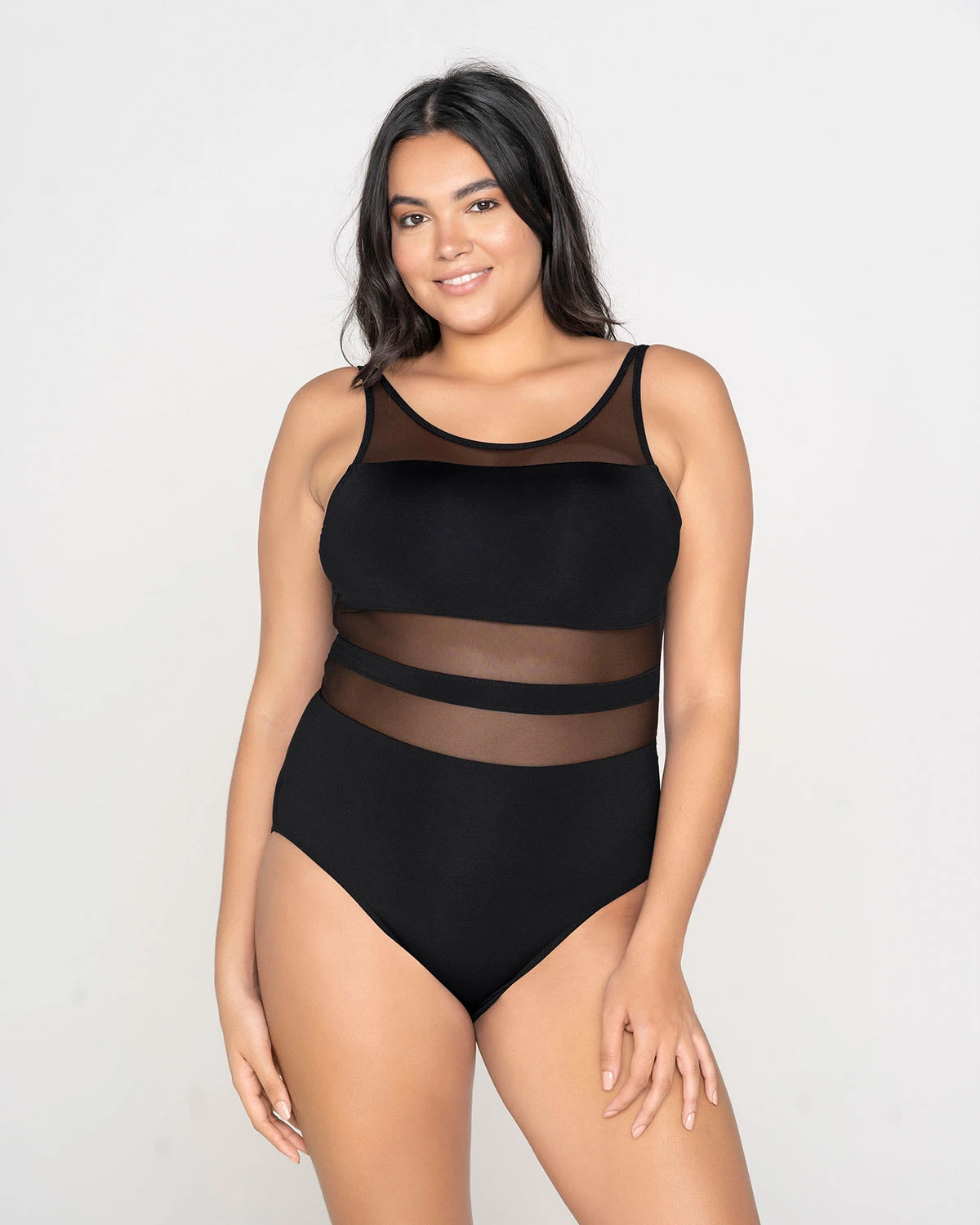 This one-piece swimsuit smooths out your curves in style. It has built-in compression to gently flatten the lower tummy. Fixed contour cups and an elasticated underbust band offer a rounding effect, while wide straps provide extra support. Mesh cutouts at the waist and chest create a unique silhouette.