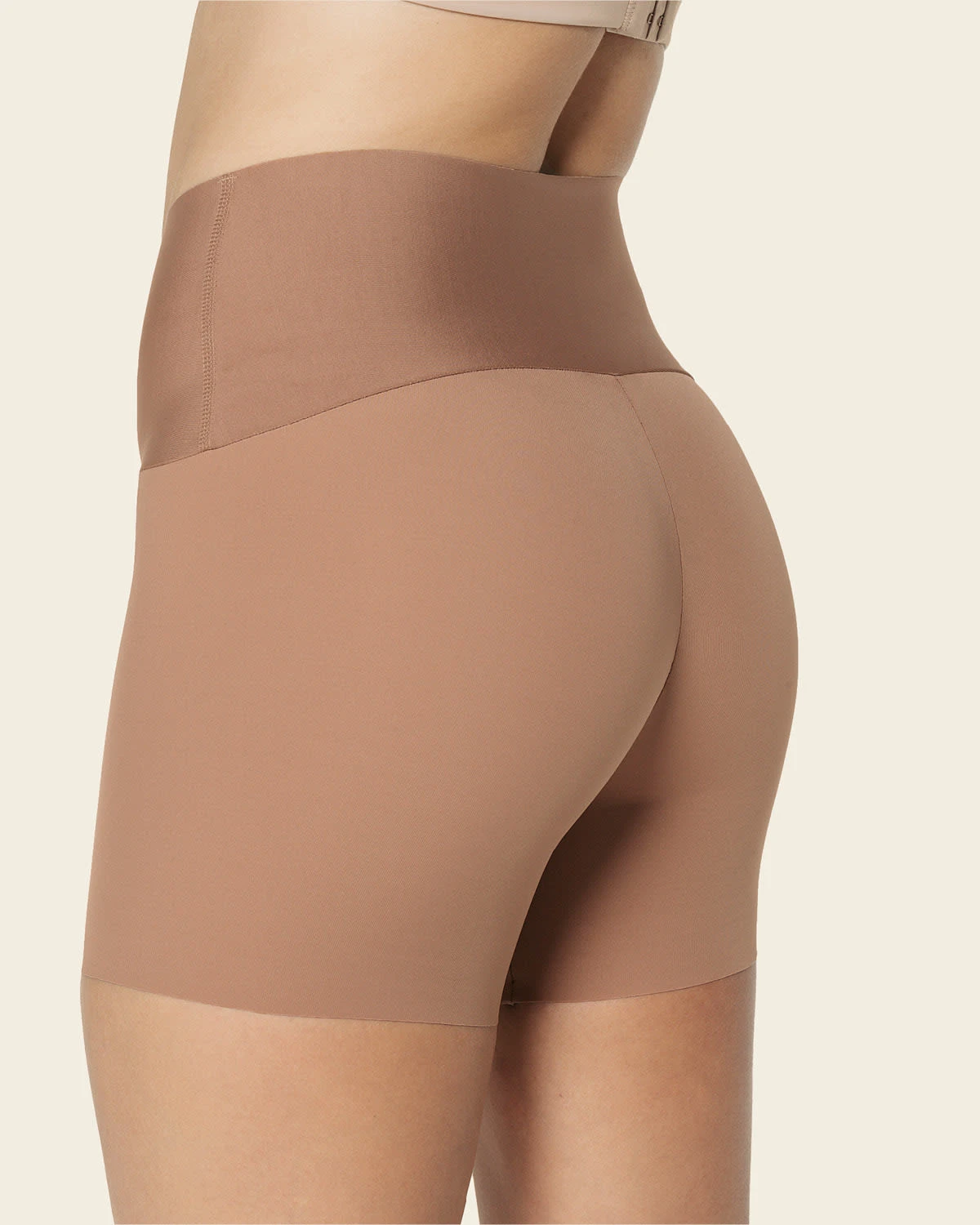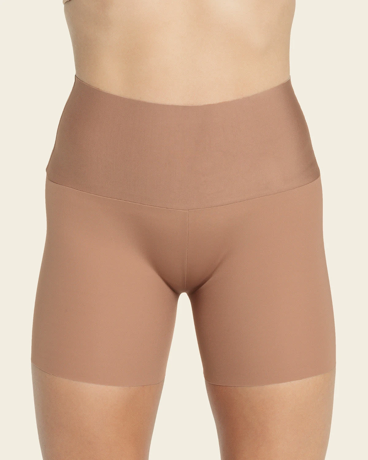 - A high-waisted, mid-thigh slip short with built-in moderate compression.